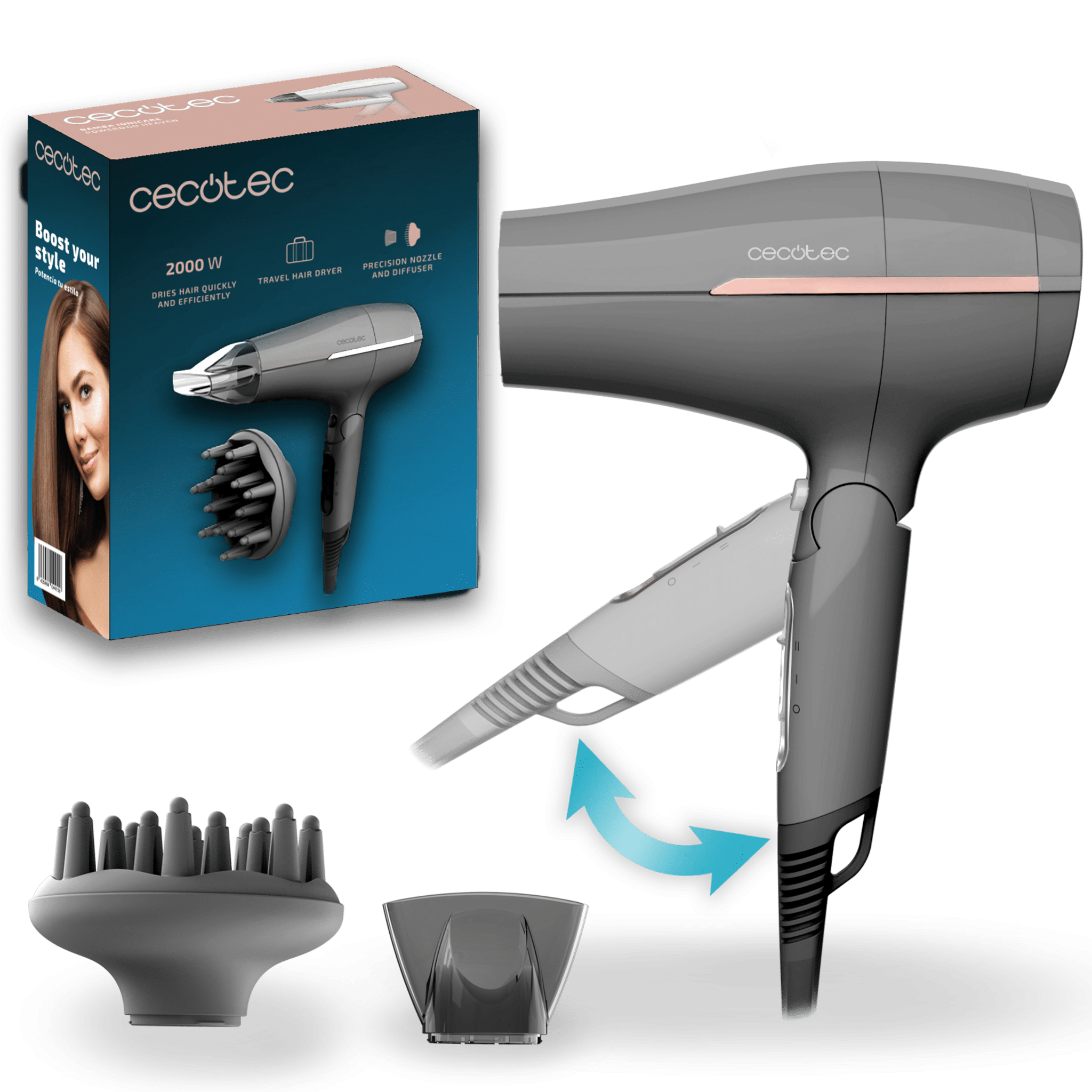 Secador de pelo de viaje, con 2000 W, 2 temperaturas, 2 velocidades, botón de aire frío, boquilla concentradora y difusor