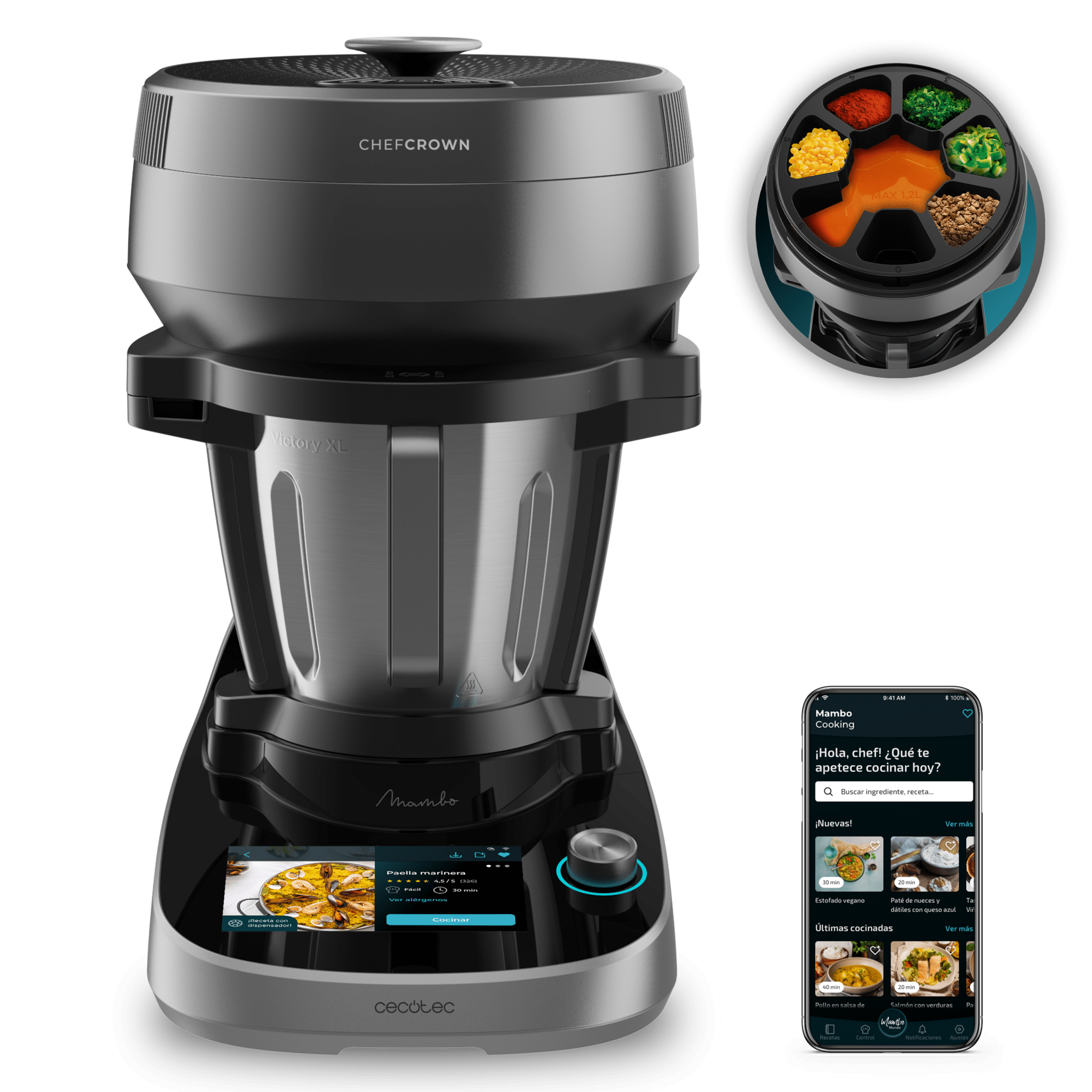 Robot de cocina multifunción con dispensador de alimentos y 45 funciones. Miles de recetas gratis guiadas paso a paso. Jarra Victory multifunción de 5L, ideal para amasados y repostería. Accesorios que completan tu cocina como vaporera o cesto para hervir, entre otros.
