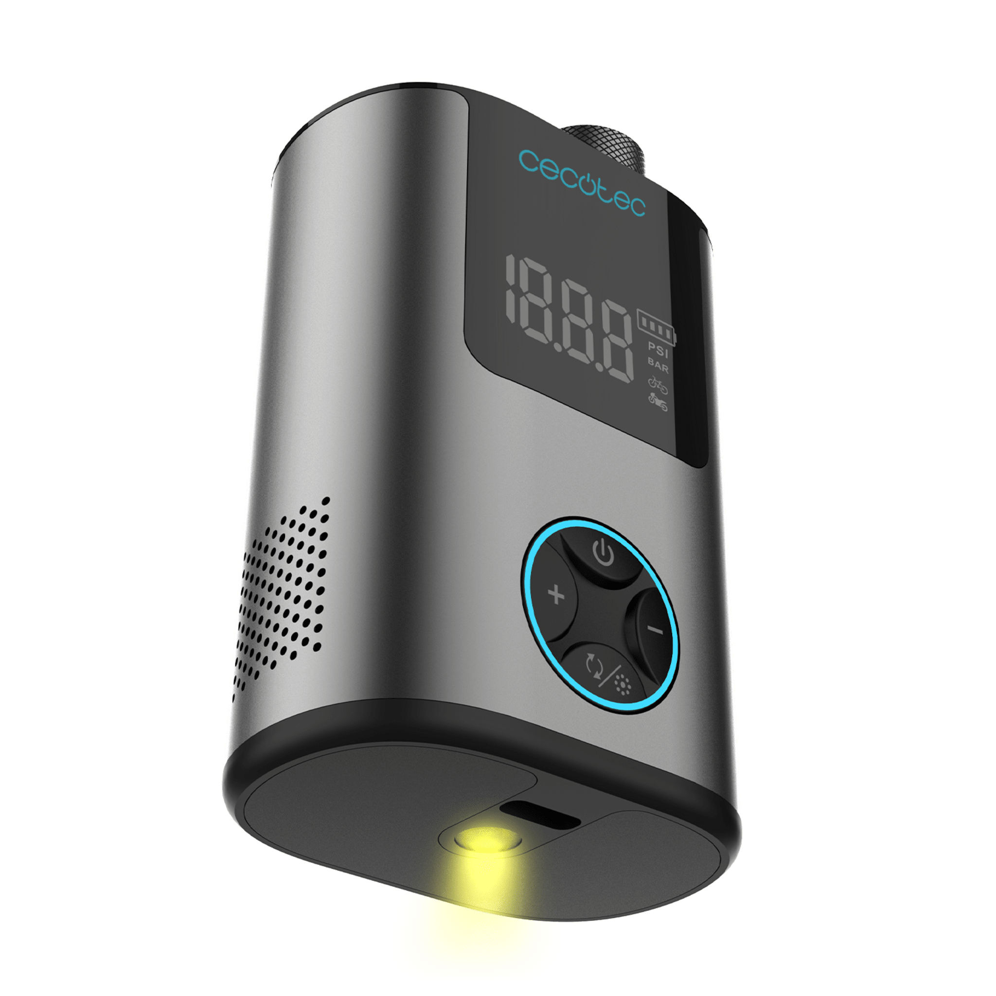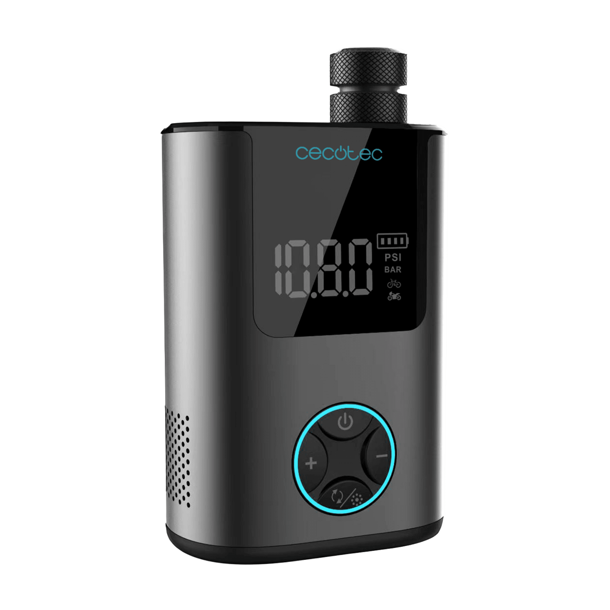 Inflador eléctrico compacto para bicicleta, moto, coche, patinetes y balones. Con doble batería de 600 mAh y capacidad inflado de hasta 150psi para dos neumáticos de bicicleta. Gracias a su peso de 150gr y su tamaño compacto se puede transportar fácilmente en la mochila o el bolsillo.