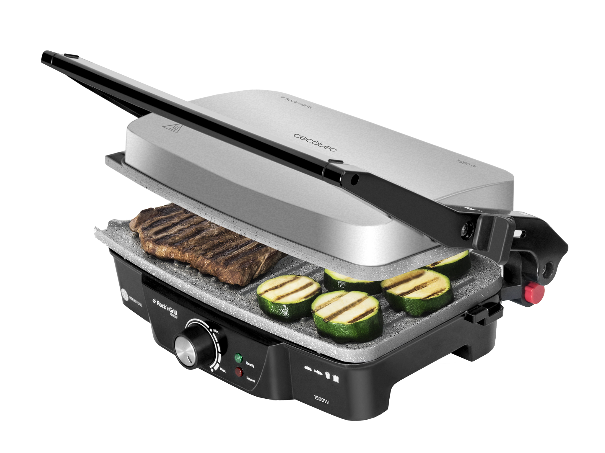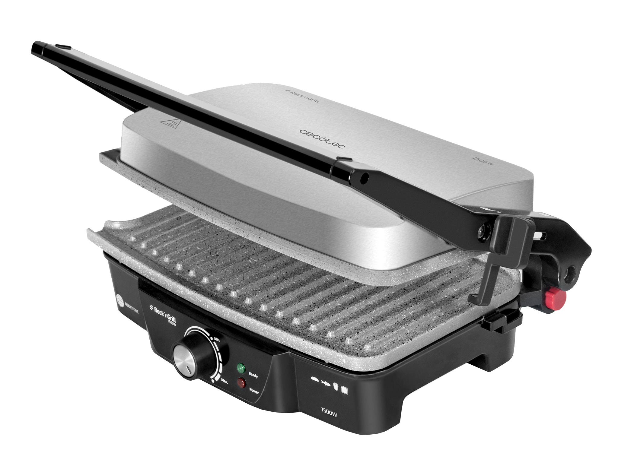 Parrilla Eléctrica Rock’n Grill 1500. Revestimiento de Piedra Rockstone, 1500 W, Regulador de Temperatura, Apertura 180º, Superficie 28.7 x 17 cm, Acero Inoxidable y Plástico