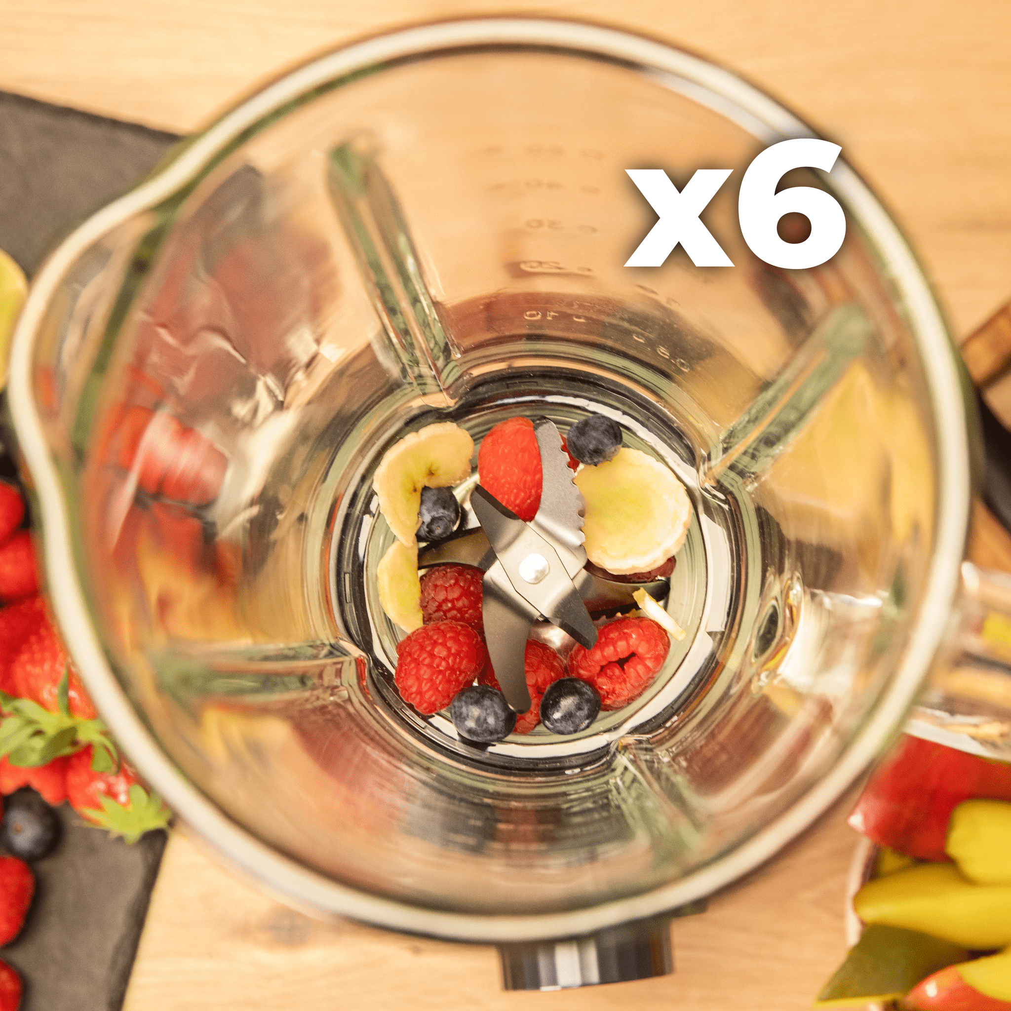 Batidora de vaso con 2200W de maxima potencia y 6 cuchillas de acero inoxidable. Pica hielo, función turbo, función Smoothie, función AutoClean.