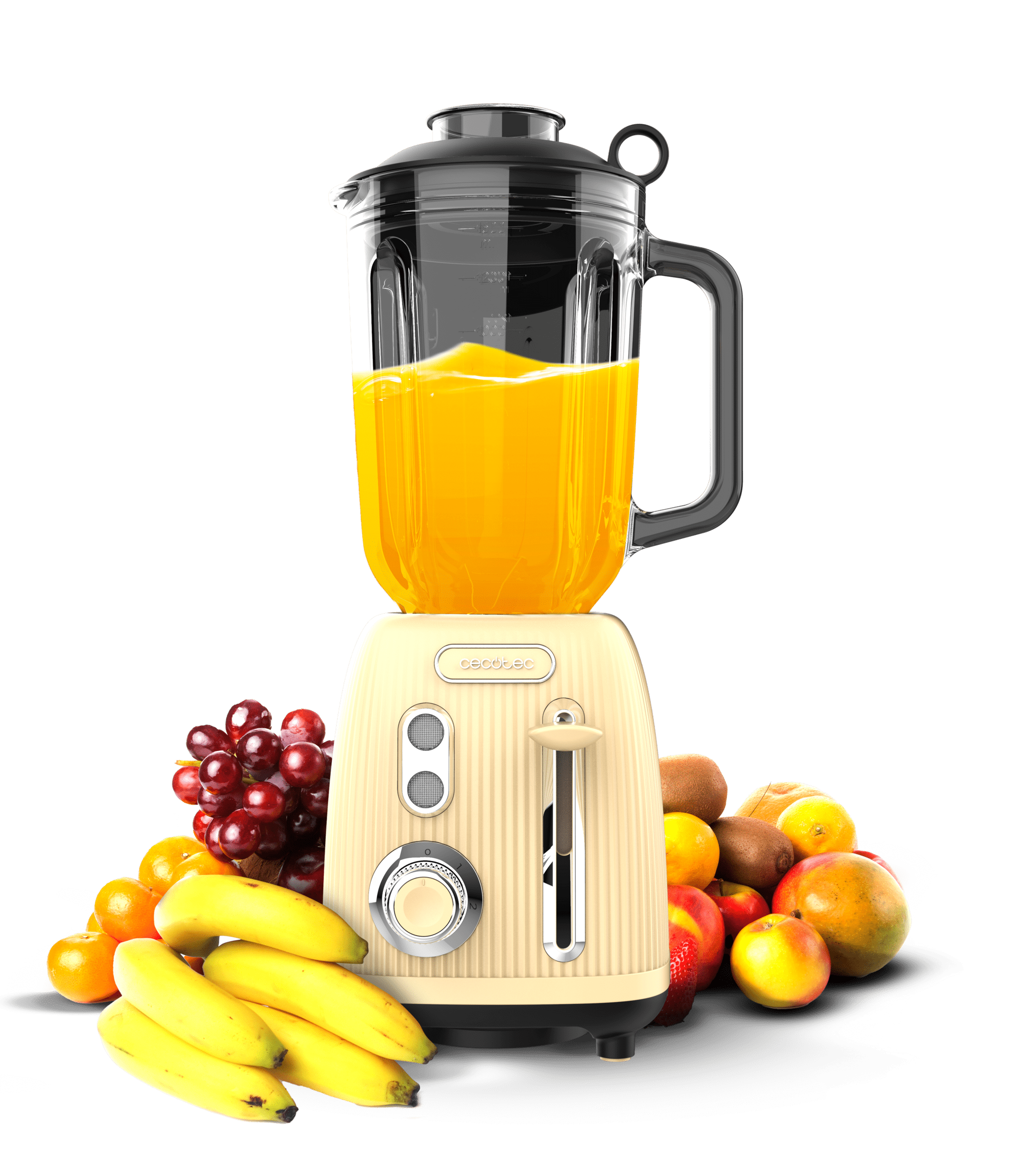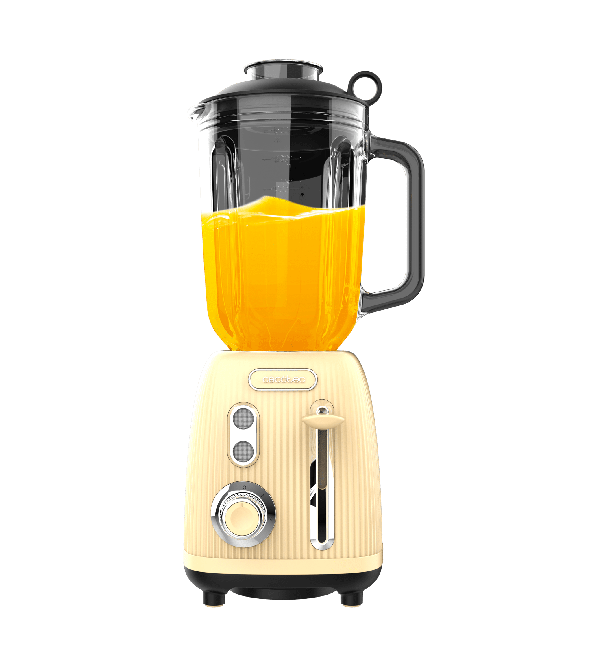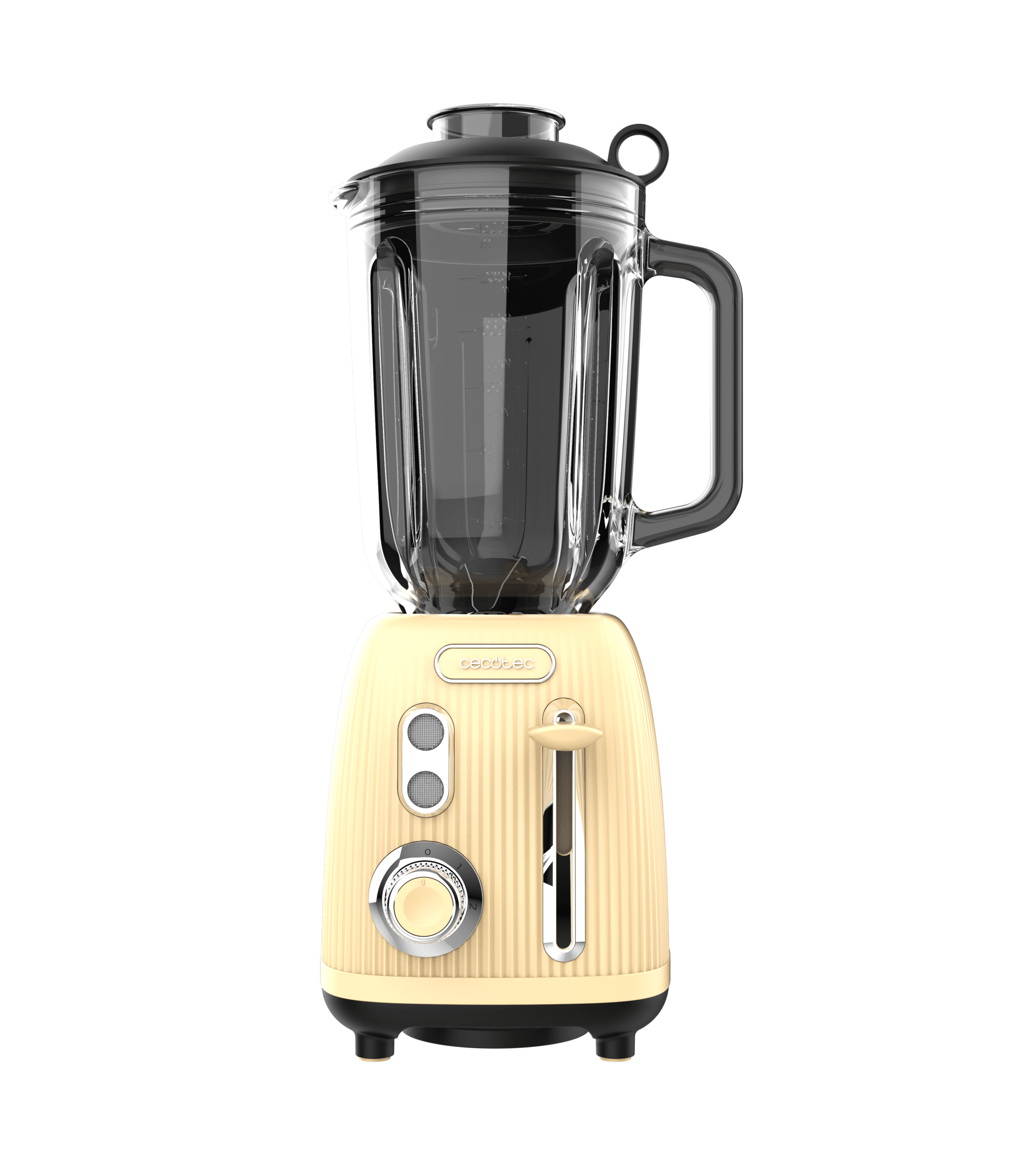Batidora de vaso retro con 1200W de potencia máxima, cuchilla de 4 hojas con recubrimiento de titanio negro y jarra con 1,5L de capacidad.