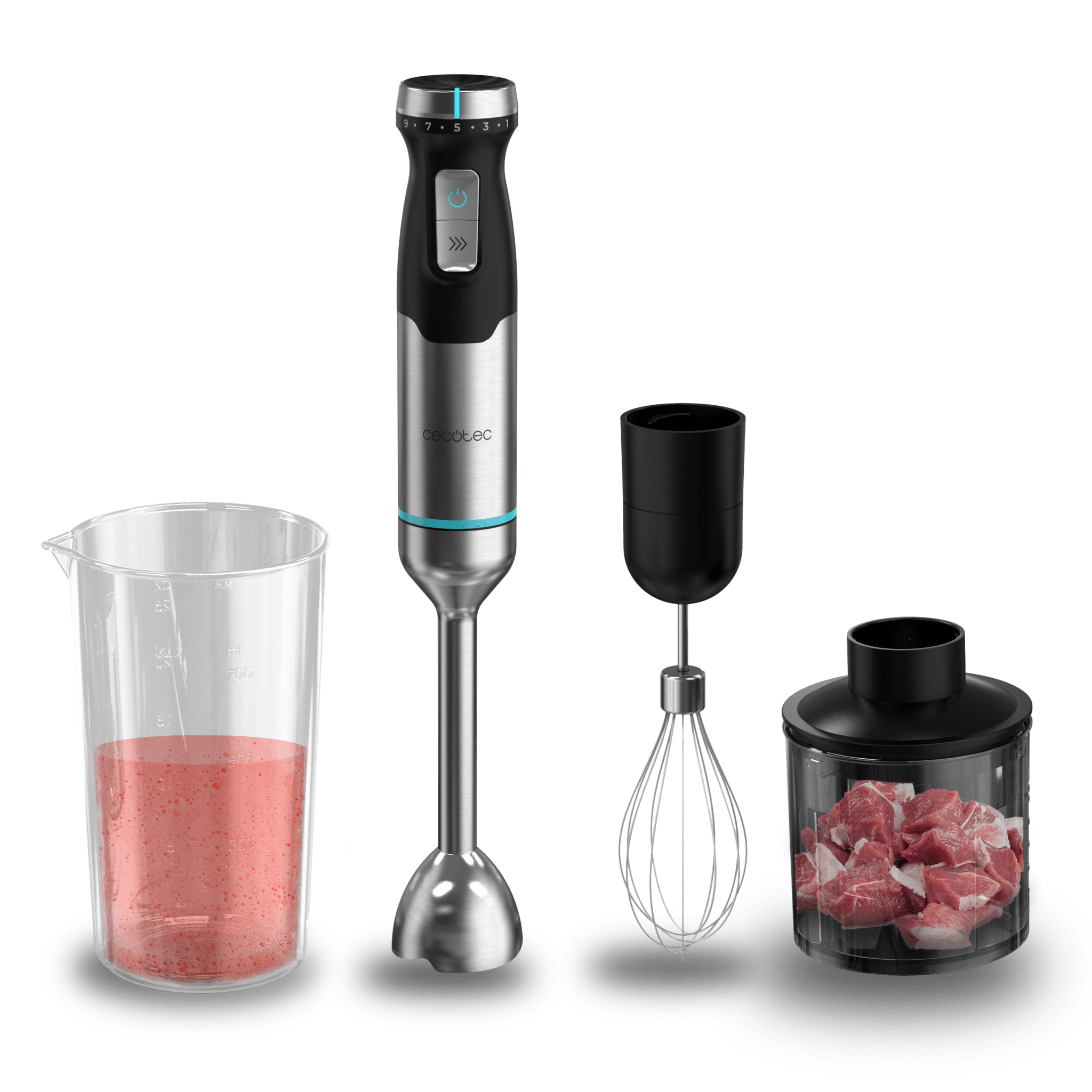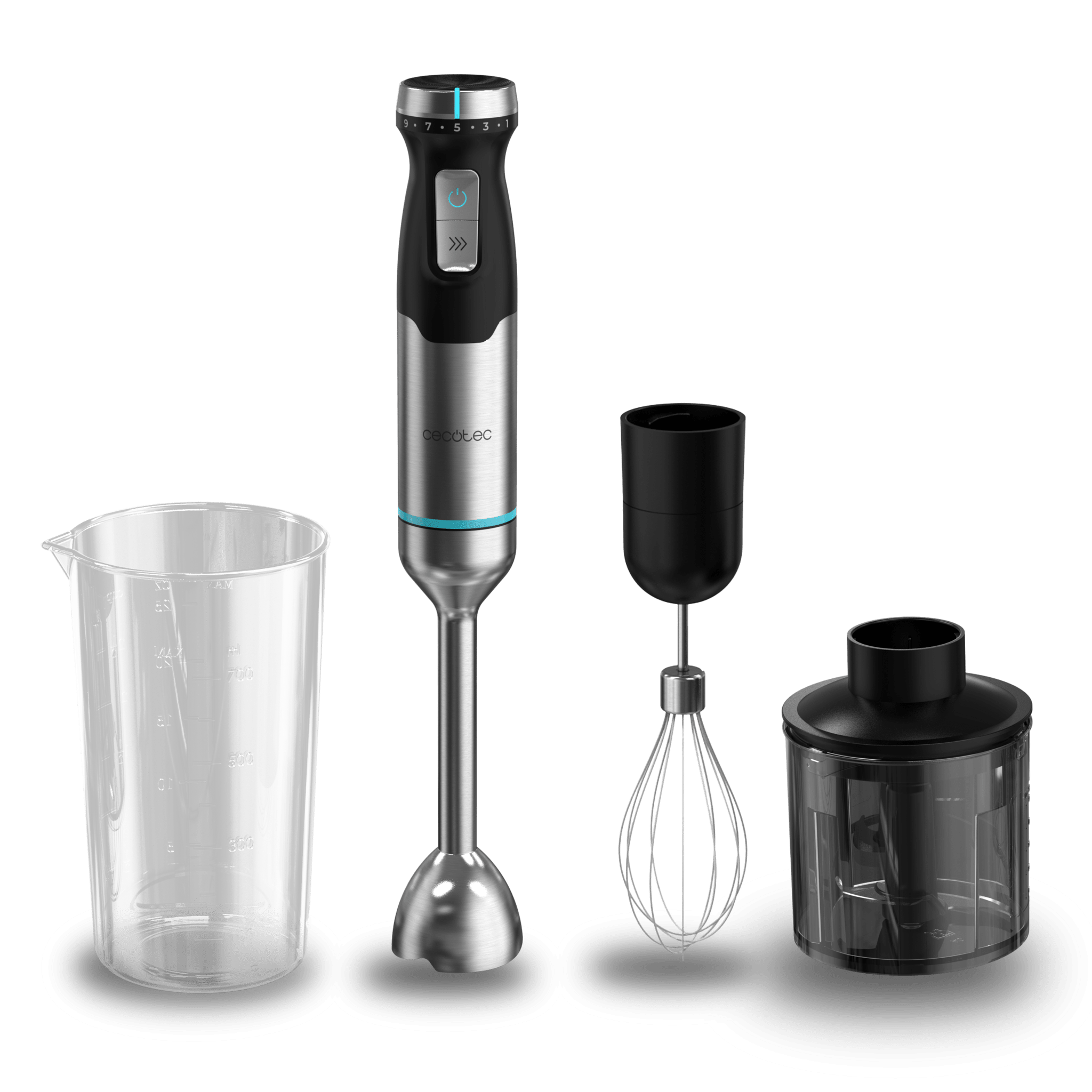Batidora De Mano De 2300 W de maxima potencia, Tecnología Crossblades Con Cuchillas De 4 Hojas Con Recubrimiento De Titanio Negro, Pie Xl Extralargo, Campana Antisalpicaduras Y Selector De Velocidad Con Función Turbo. Incluye Vaso De 800 Ml Con Tapa.