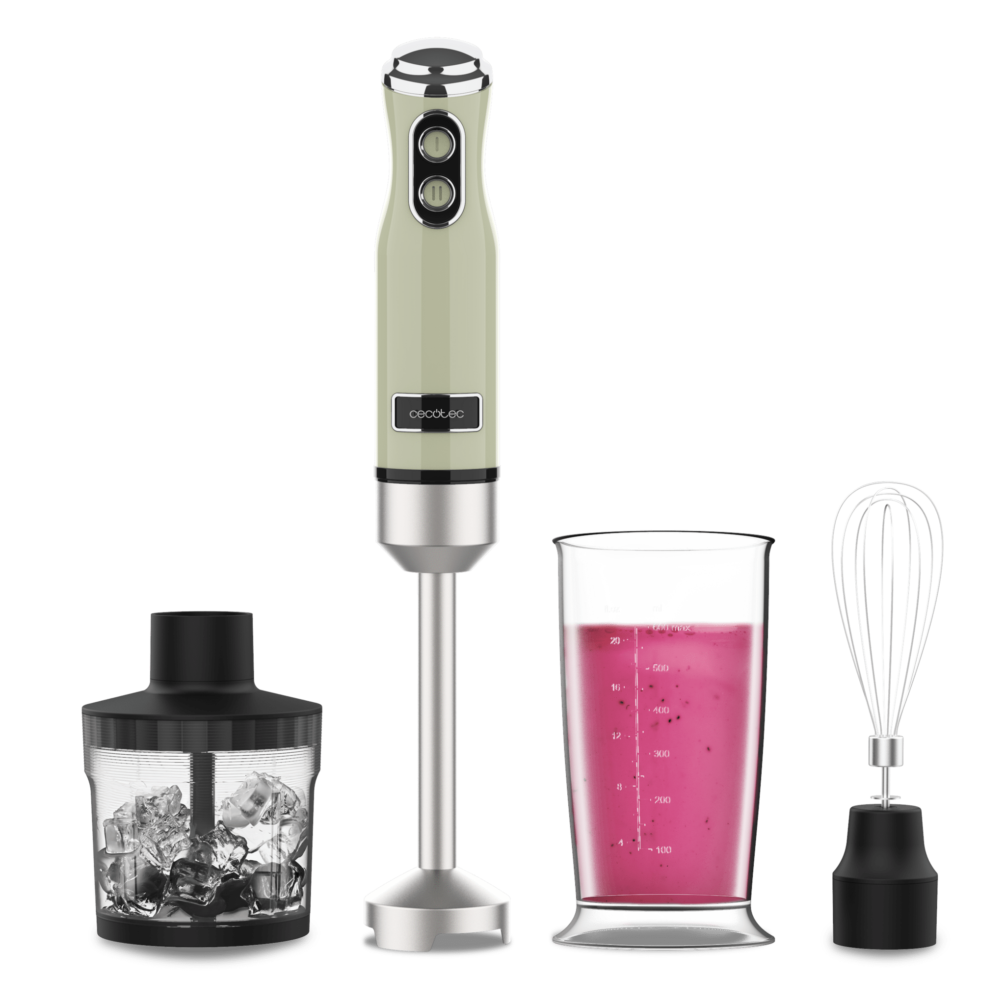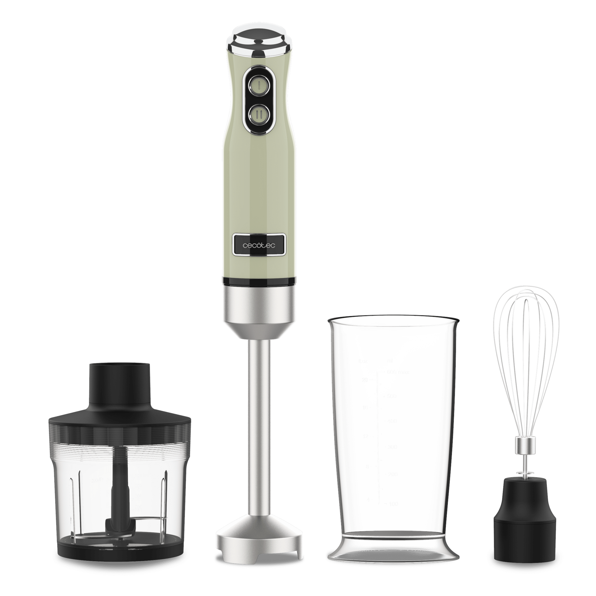 Batidora de mano retro con 1200 W de potencia máxima, cuchilla de 4 hojas con recubrimiento de titanio negro y velocidad ajustable.