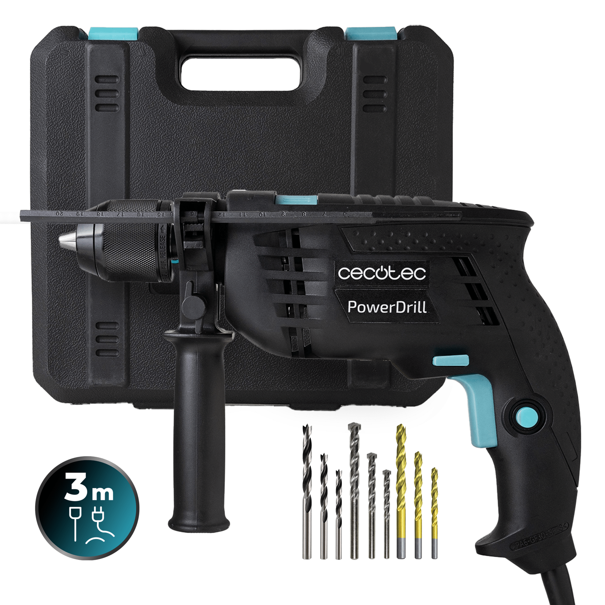 Taladro eléctrico con percutor de 850 W. Portabrocas metálico de 13mm. Alta velocidad de 4800 rpm y percutor a 46000 impactos por minuto. Incluye un maletín con 9 brocas y una empuñadura auxiliar.