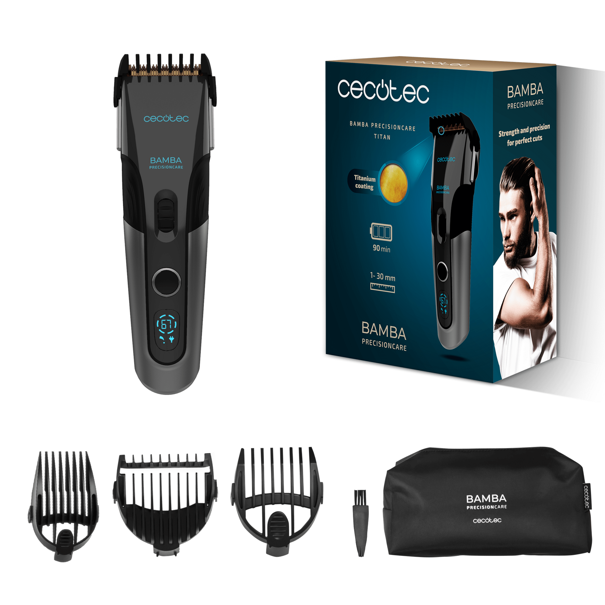 Cortapelos Bamba PrecisionCare Titanium. Cuchilla de Acero Inoxidable con Revestimiento de Titanio, Batería de Litio, Autonomía hasta 120 minutos, Uso con y sin Cable, 3 Peines