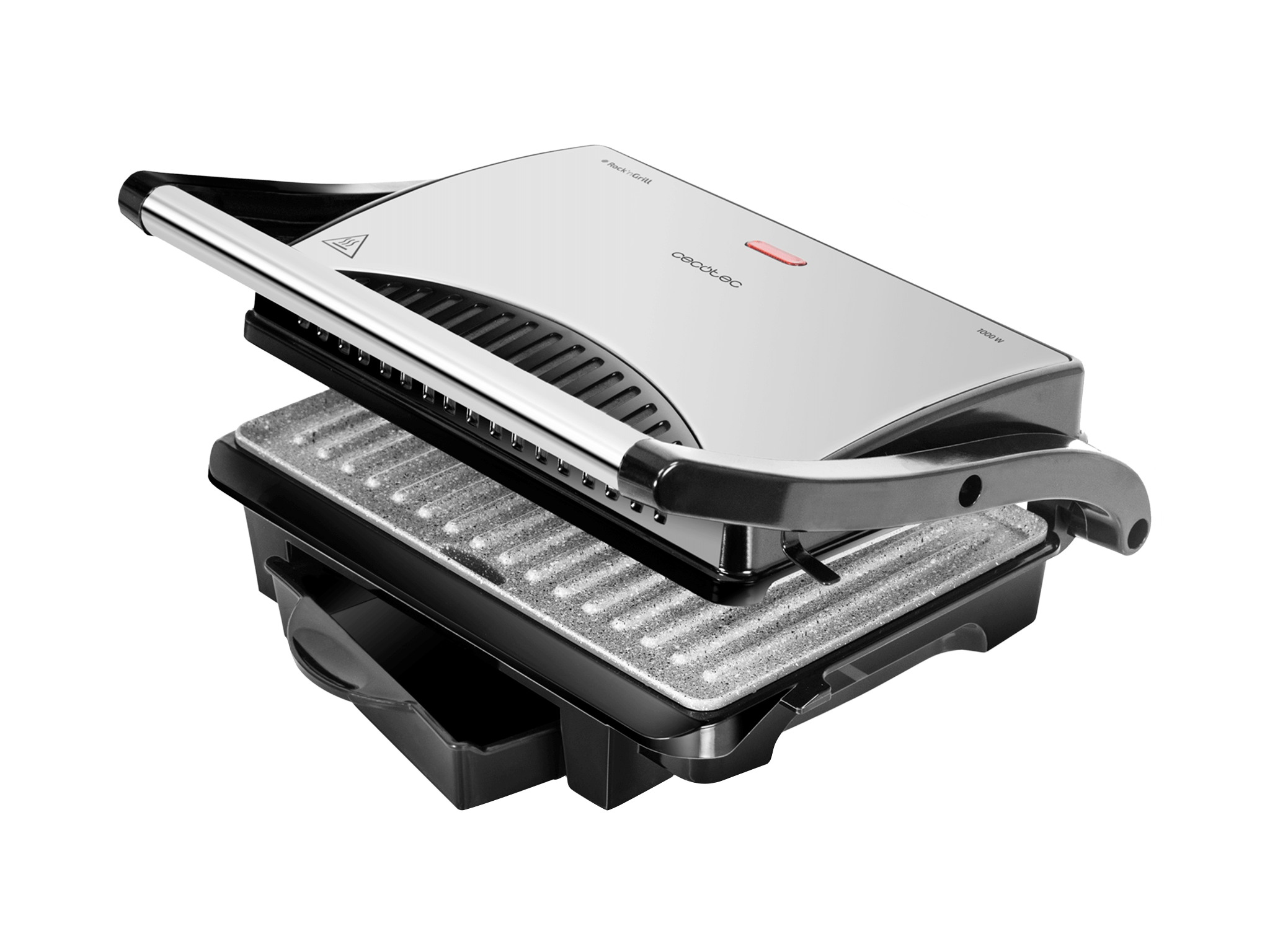 Parrilla Eléctrica Rock’nGrill 1000. 1000 W, Revestimiento Antiadherente RockStone, Placa superior flotante, Cajetín recogegrasas, 25.5 x 29.5 x 10 cm, Color Acero/Negro