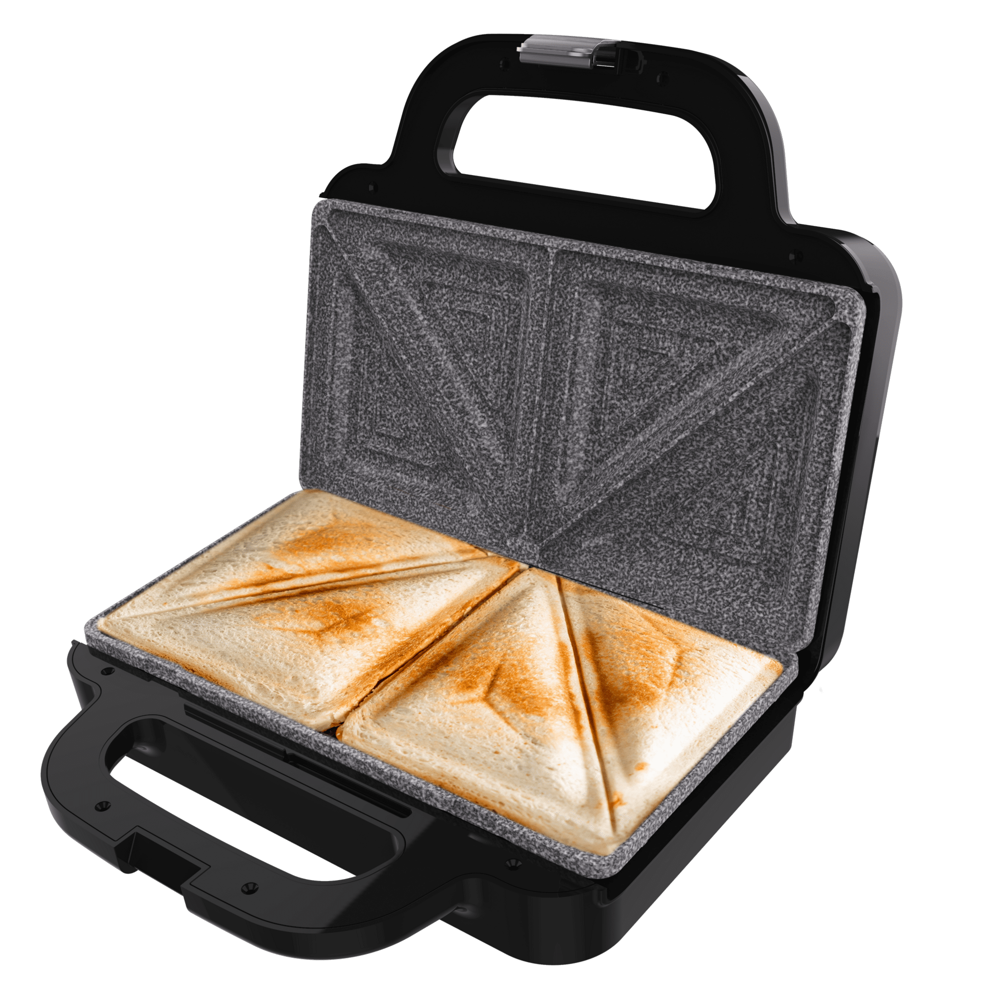 Sandwichera con capacidad para dos sandwiches con rellenos generosos y placas de sandwiches triangulares.