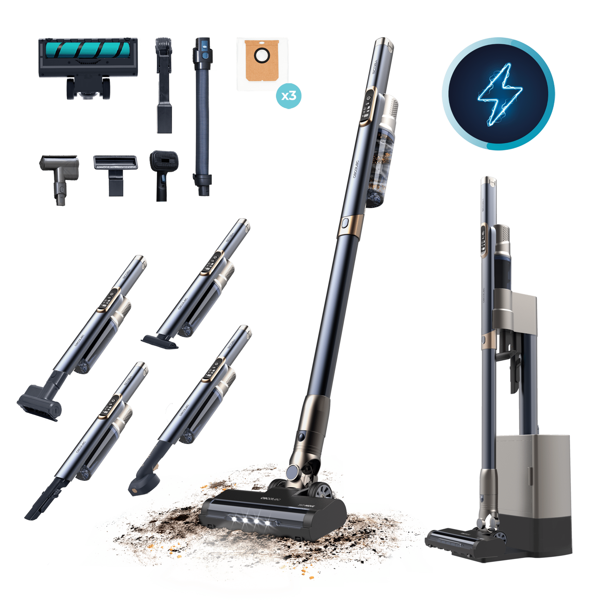 Aspirador vertical ligero con base de autovaciado Scoba 3000 Station. Motor Digital Brushless de 210 W y 20 kPa de presión de succión. Autonomía de hasta 40 minutos. Dos modos de succión. Cepillo Jalisco. Con accesorio 2 en 1 para muebles y accesorio para tapicerías.