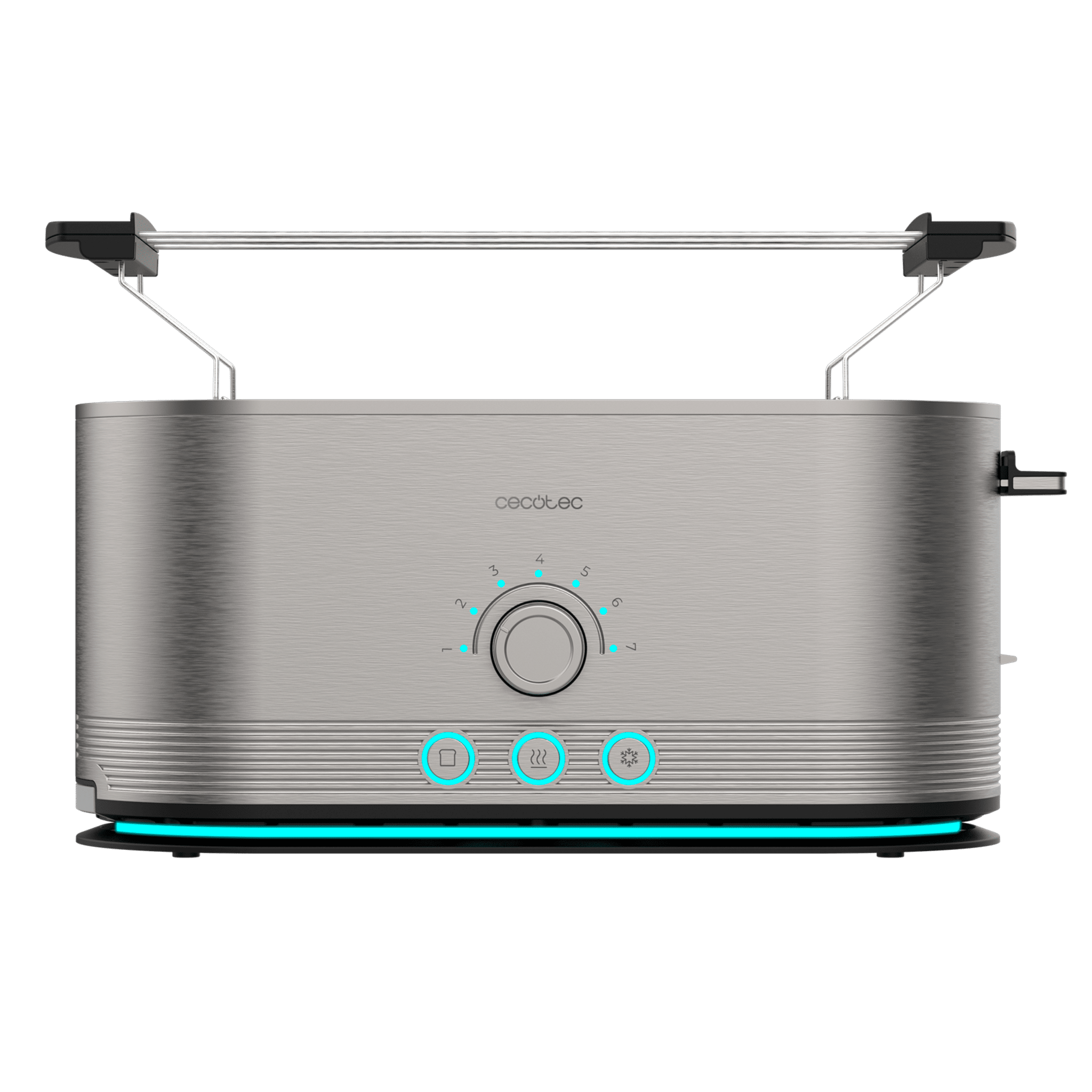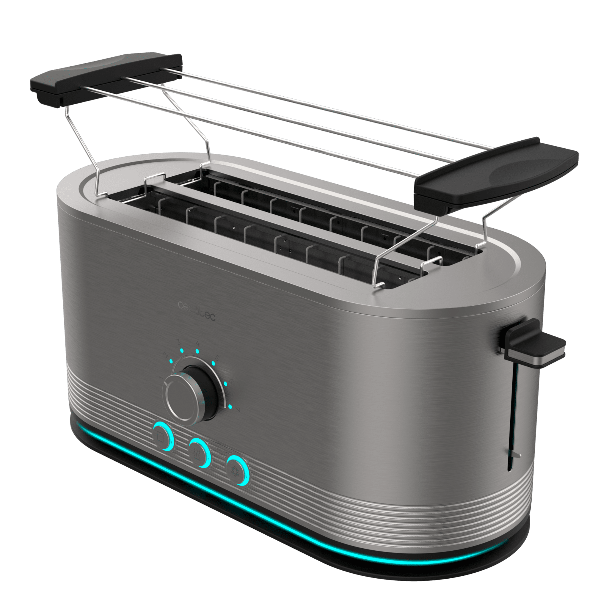 Shine&Toast Extra Double. Anillo luminoso. 4 tostadas. 1400W. Rebanadas de 3,8 cm. Inox. Varillas superiores. Autocentrado.