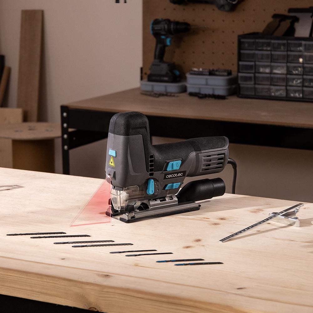 Sierra de calar con 800W de potencia. Corte pendular. Plataforma de aluminio fundido y mandril sin llave. Láser guía y luz LED. Cable 2m. Incluye 8 sierras y regla guía.