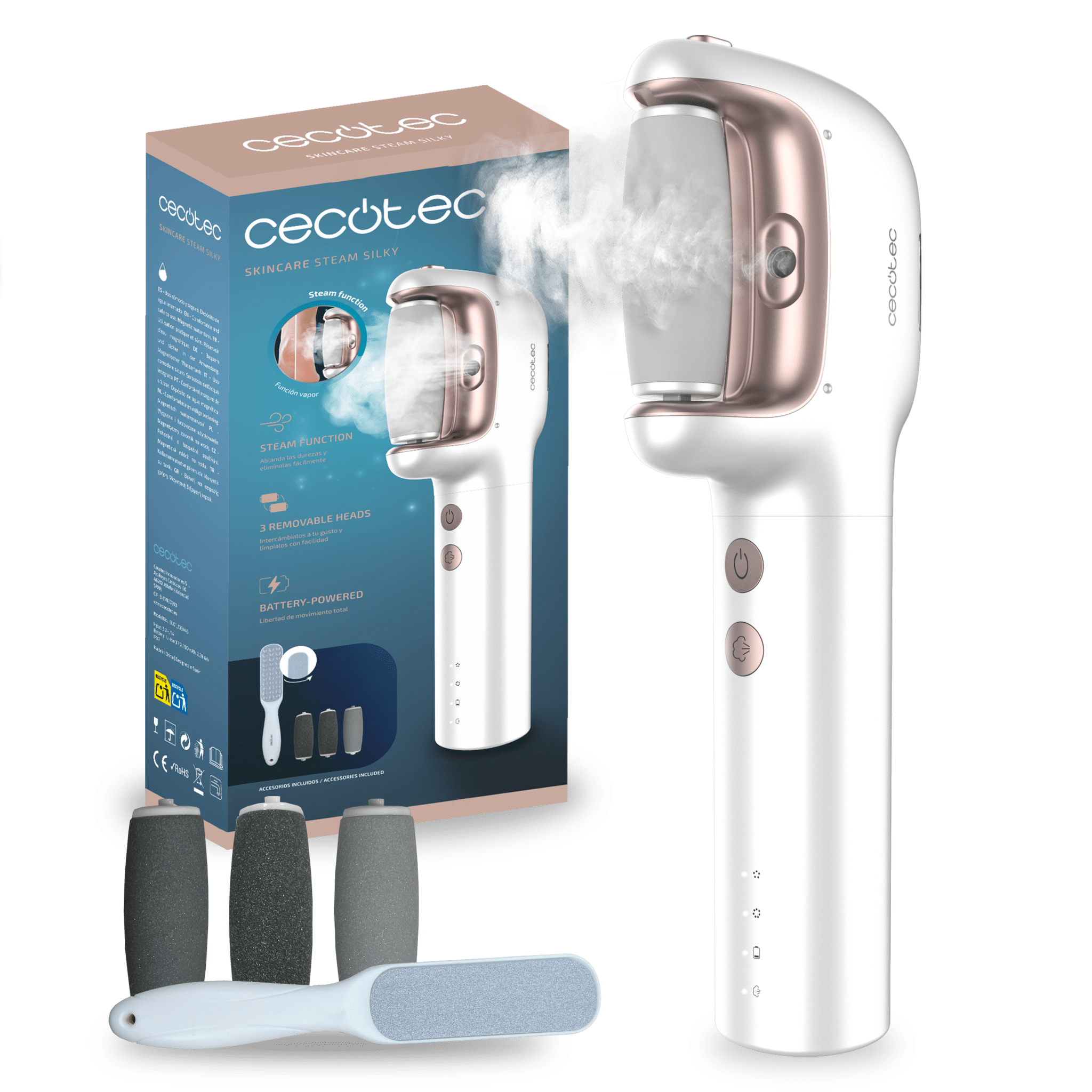 SkinCare Steam Silky – Lima Eléctrica para Pies con Función Vapor, 3 Cabezales extraíbles, Waterproof IPX7, 3 Velocidades y 1 Rascador