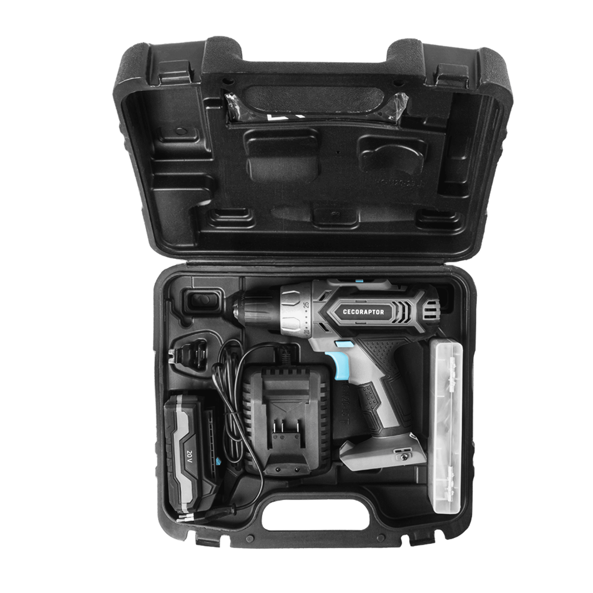 Taladro de batería de 20V y 2000 mAh con una velocidad sin carga de 1550 rpm, un torque máximo de 46 Nm, 25+1 posiciones de torque y 2 velocidades de trabajo. Portabrocas automático de sujeción rápida, luz de trabajo incorporada y autonomía de hasta 60 min.