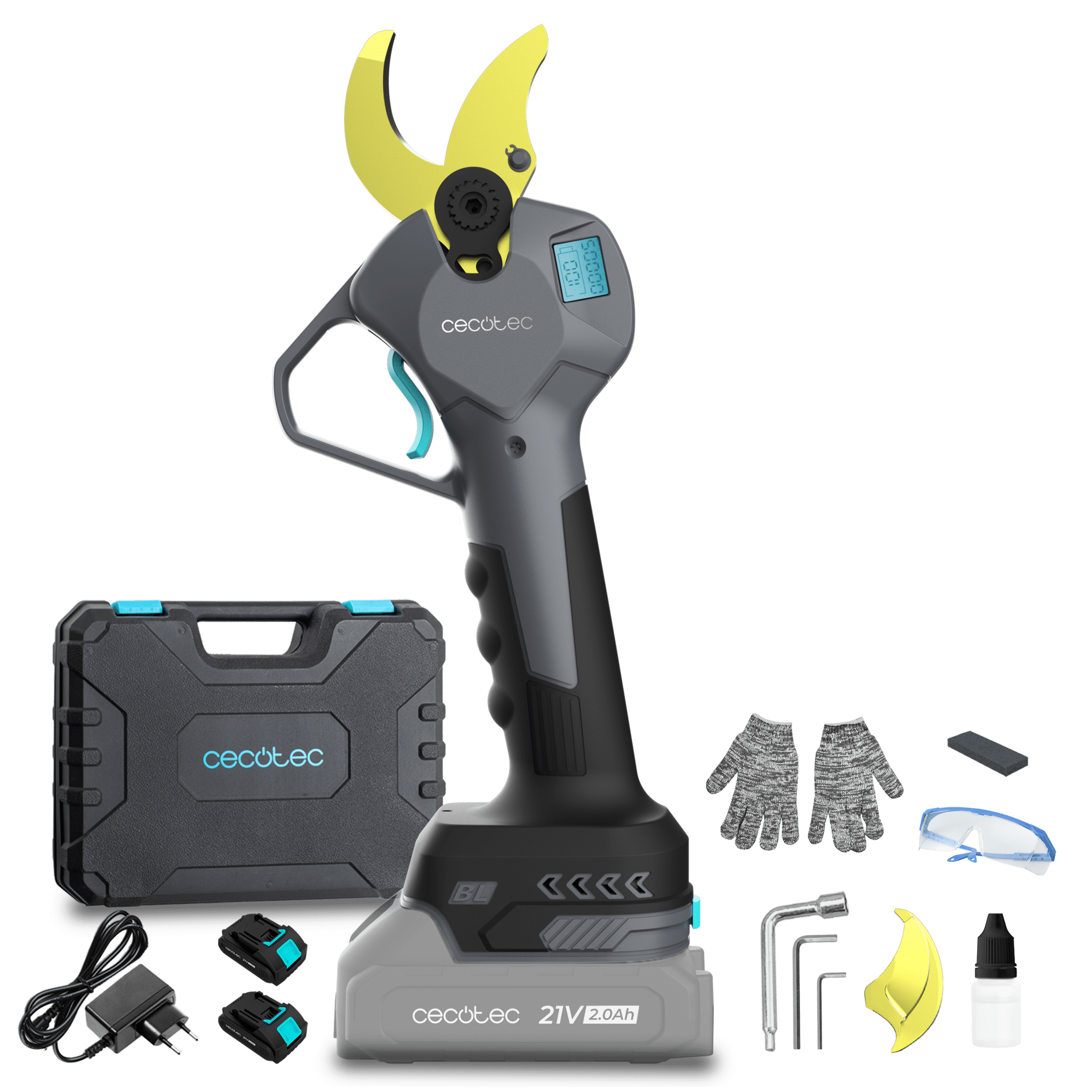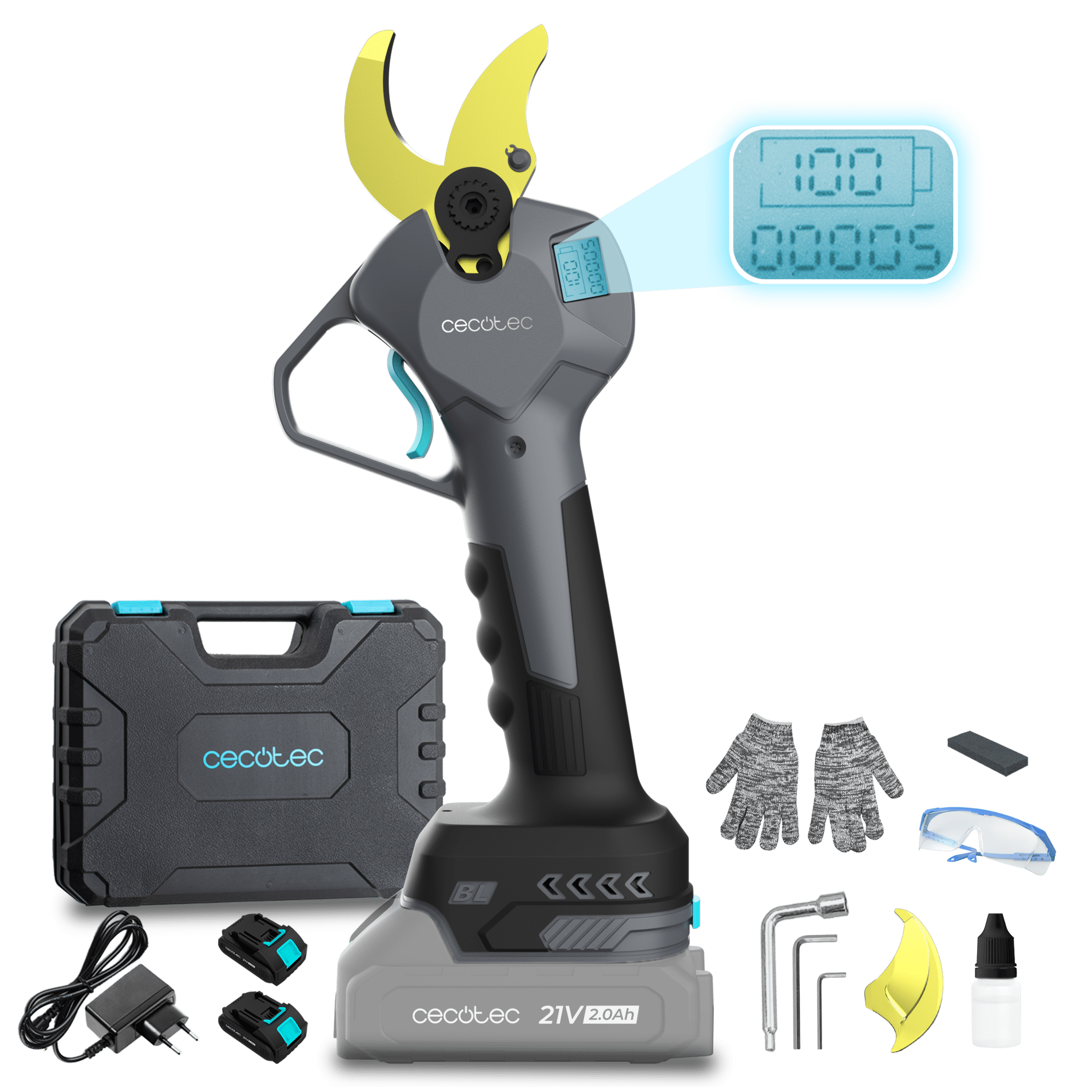 Tijeras de podar eléctricas. Dos baterías de 21V.Motor sin escobillas, Brushless. Ramas hasta 30mm. Cuchillas con revestimiento de titanio. Pantalla con control digital. Incluye maletín y accesorios.
