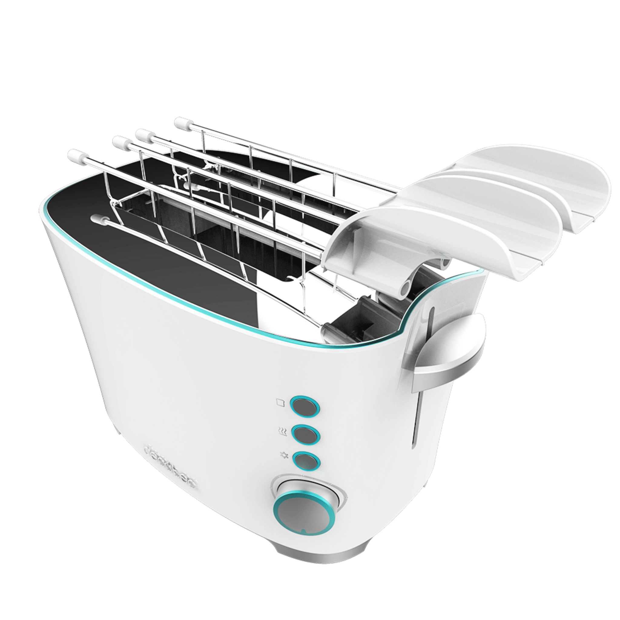 Tostadora de pan con capacidad para dos tostadas. Incluye pinzas para las tostadas. 650 W de potencia y 7 posiciones de tostado, función descongelar y función recalentar. Sistema de extraelevación, amplia bandeja recogemigas y hueco recogecables.