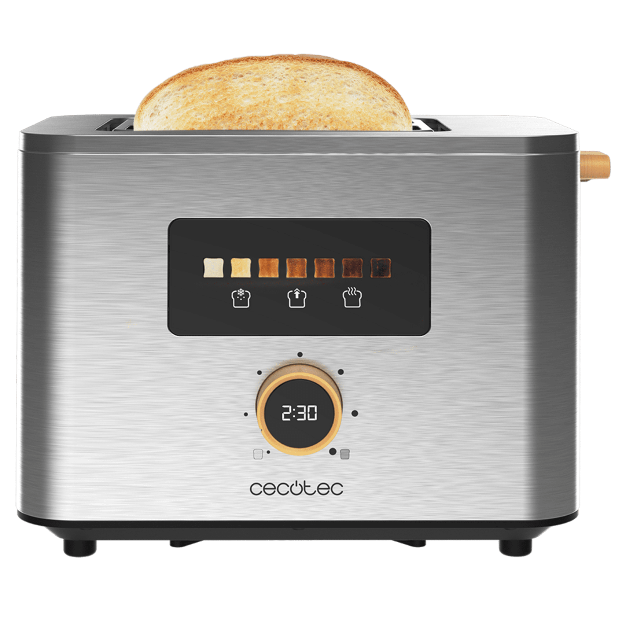 Tostador vertical de acero con doble ranura corta, pantalla táctil y 950 W de potencia.