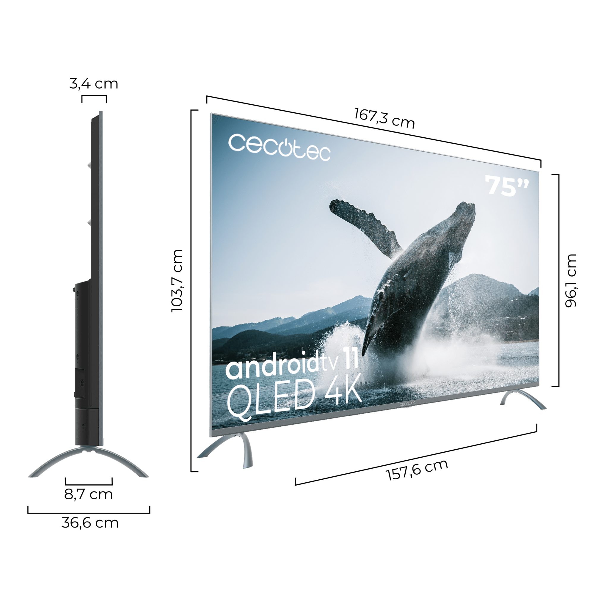 Televisión QLED de 75″ con resolución 4K UHD, sistema operativo Android TV 11, Local Dimming, Google Voice Assitant y Chromecast, sistema Dolby Vision & Atmos.