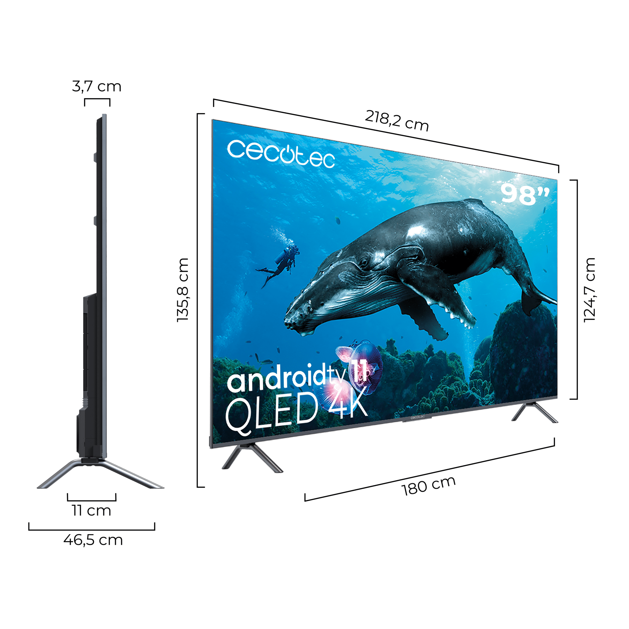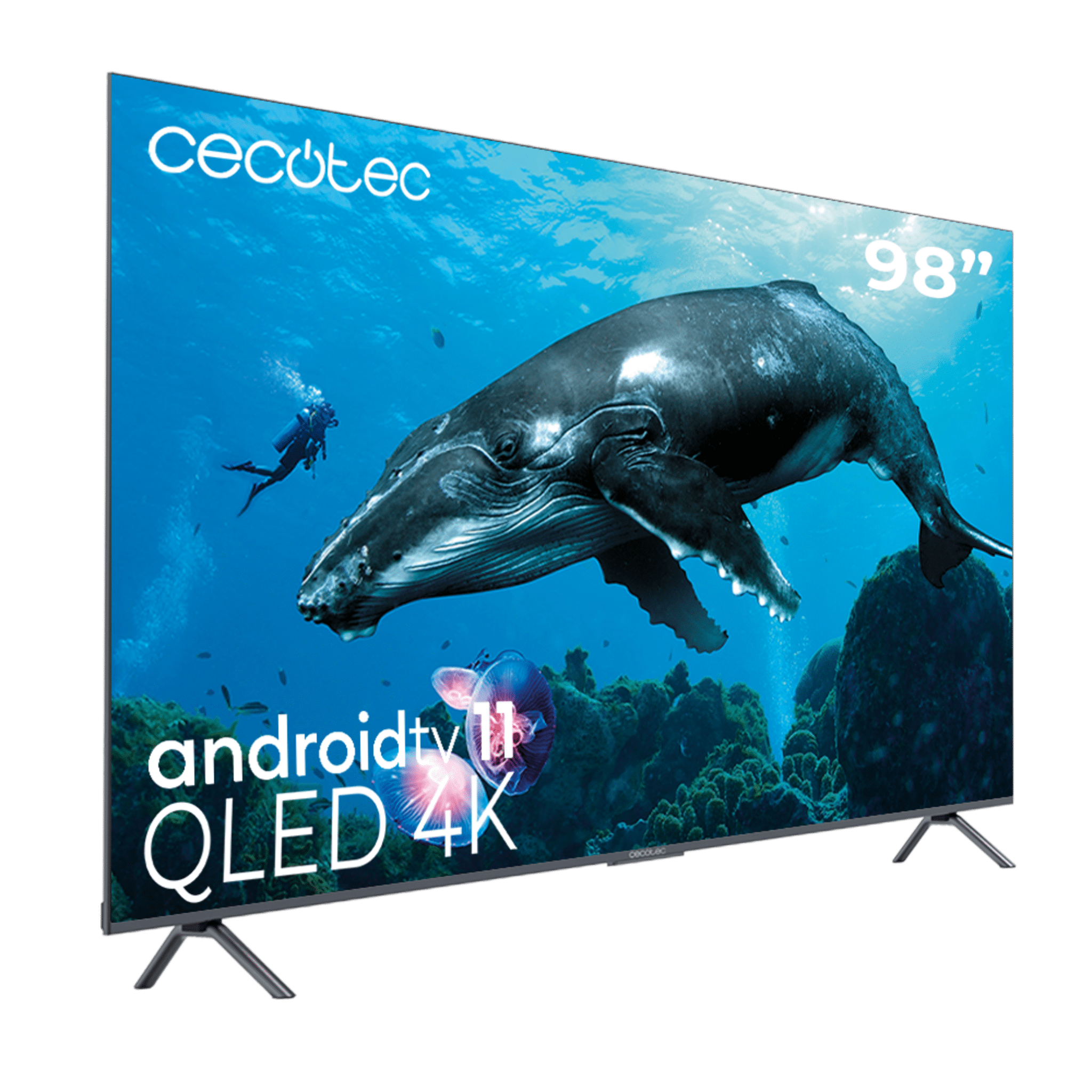 Televisión QLED de 98″ con resolución 4K UHD, sistema operativo Android TV 11, Local Dimming, Google Voice Assitant y Chromecast, sistema Dolby Vision & Atmos. Subwoofer 15W adicional.