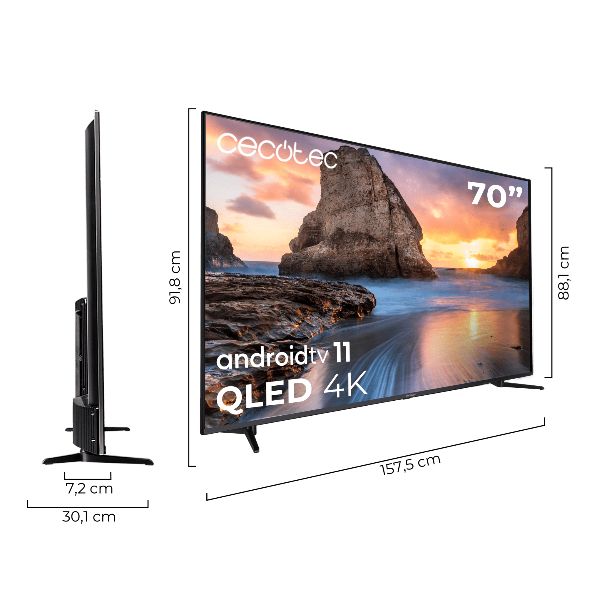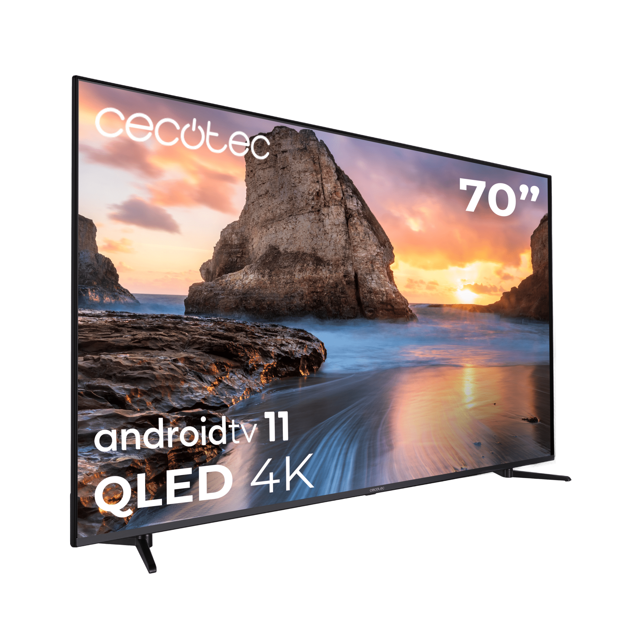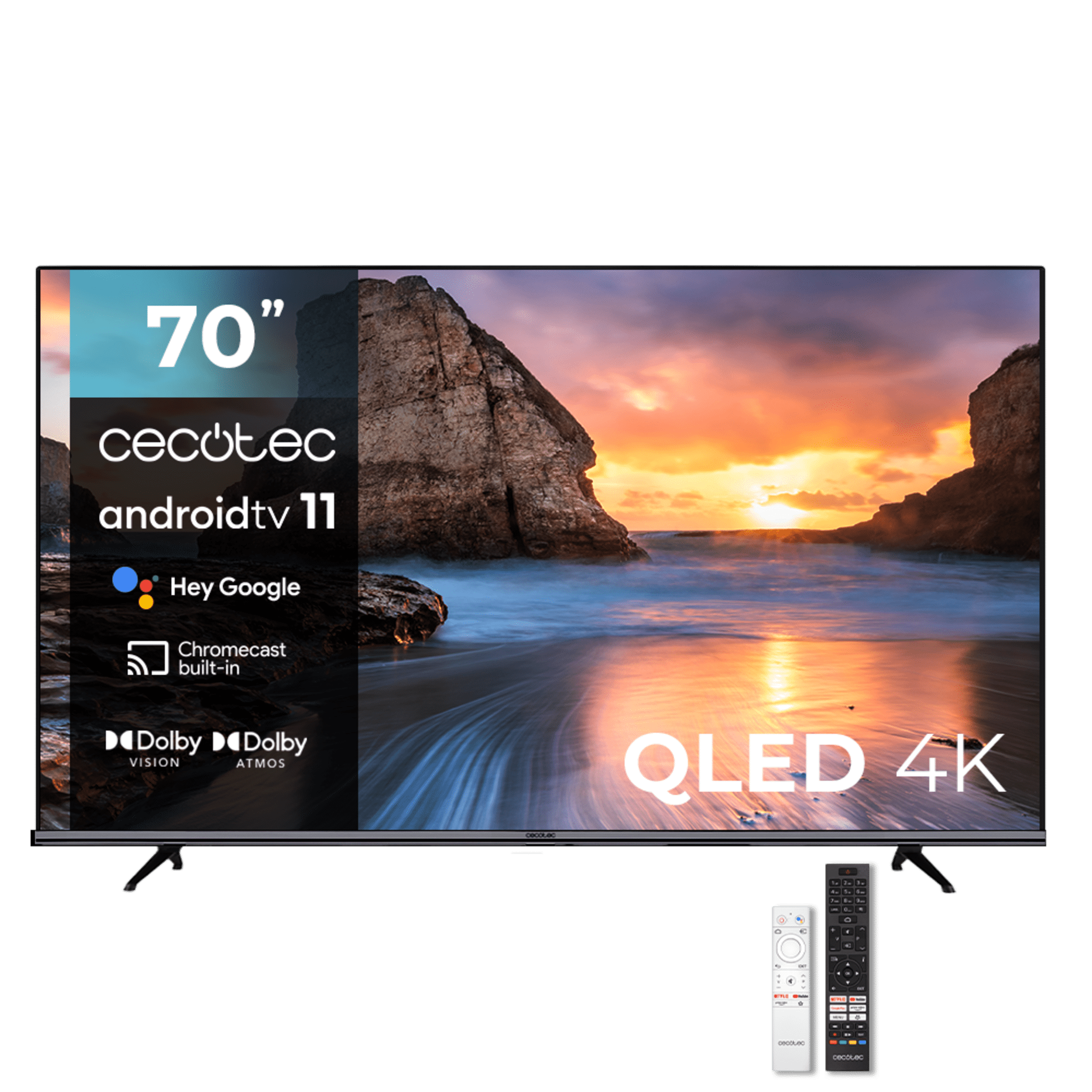 Televisión QLED 70” con resolución 4K UHD, sistema operativo Android TV 11, subwoofer incorporado +12W, Chromecast, HDR10+, Google Voice Assistant, clase E.