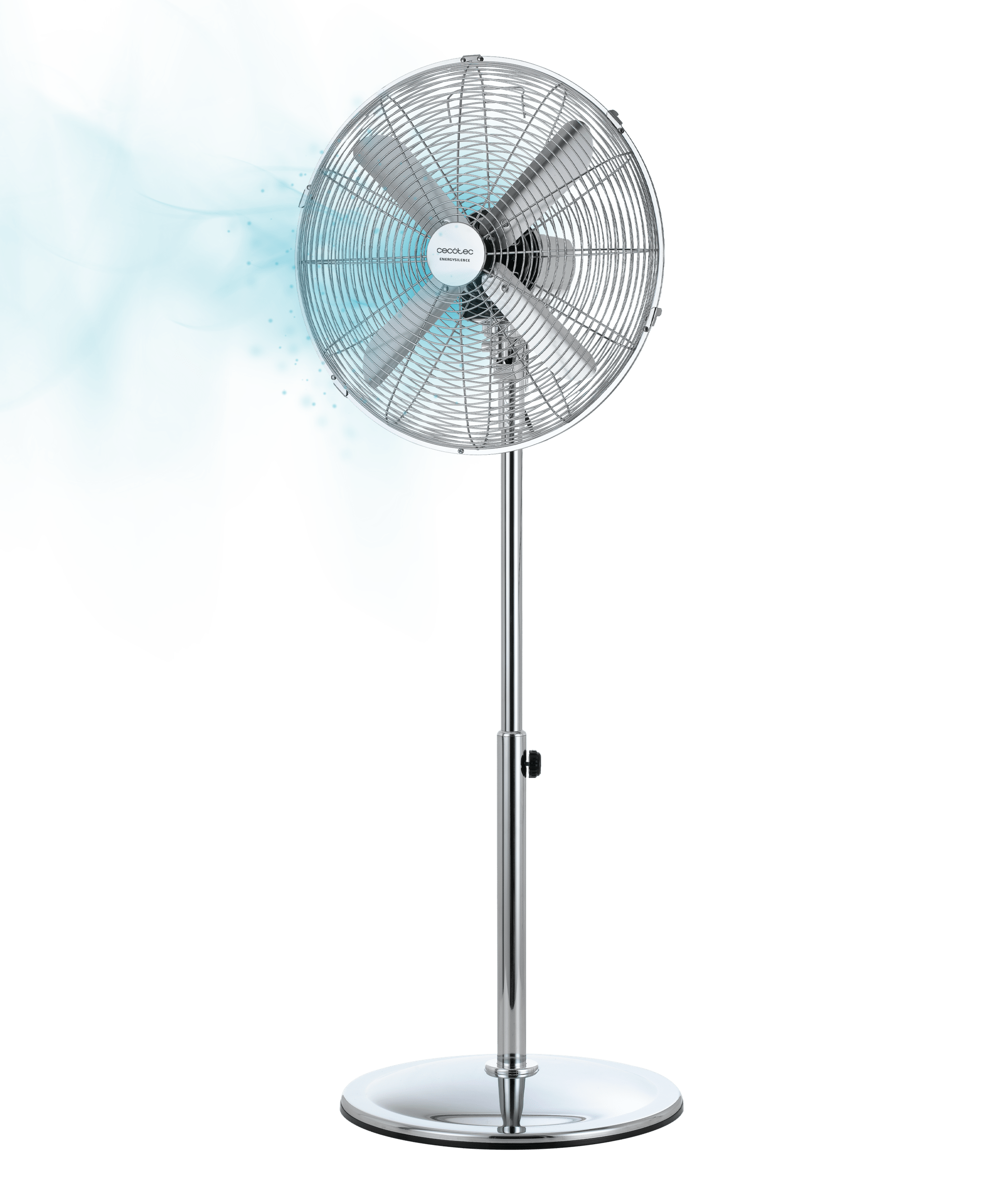 Ventilador de pie con 50 W y acabado en cromado, 16 pulgadas, 3 velocidades, oscilación, silencioso, altura ajustable, 4 aspas y máxima seguridad.
