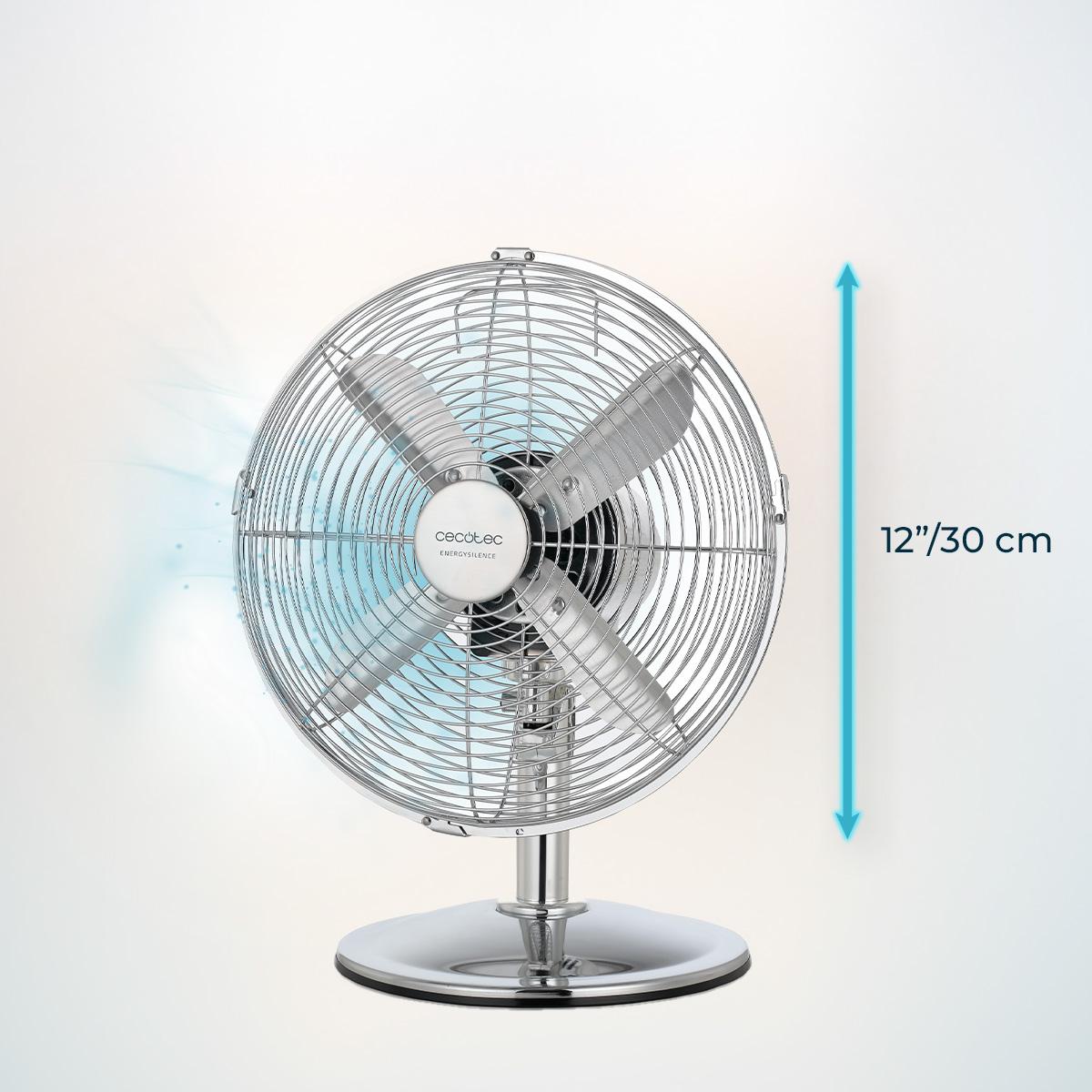 Ventilador de sobremesa con 40 W y acabado cromado, 12 pulgadas, 3 velocidades, oscilación, silencioso, altura ajustable, 4 aspas y máxima seguridad.